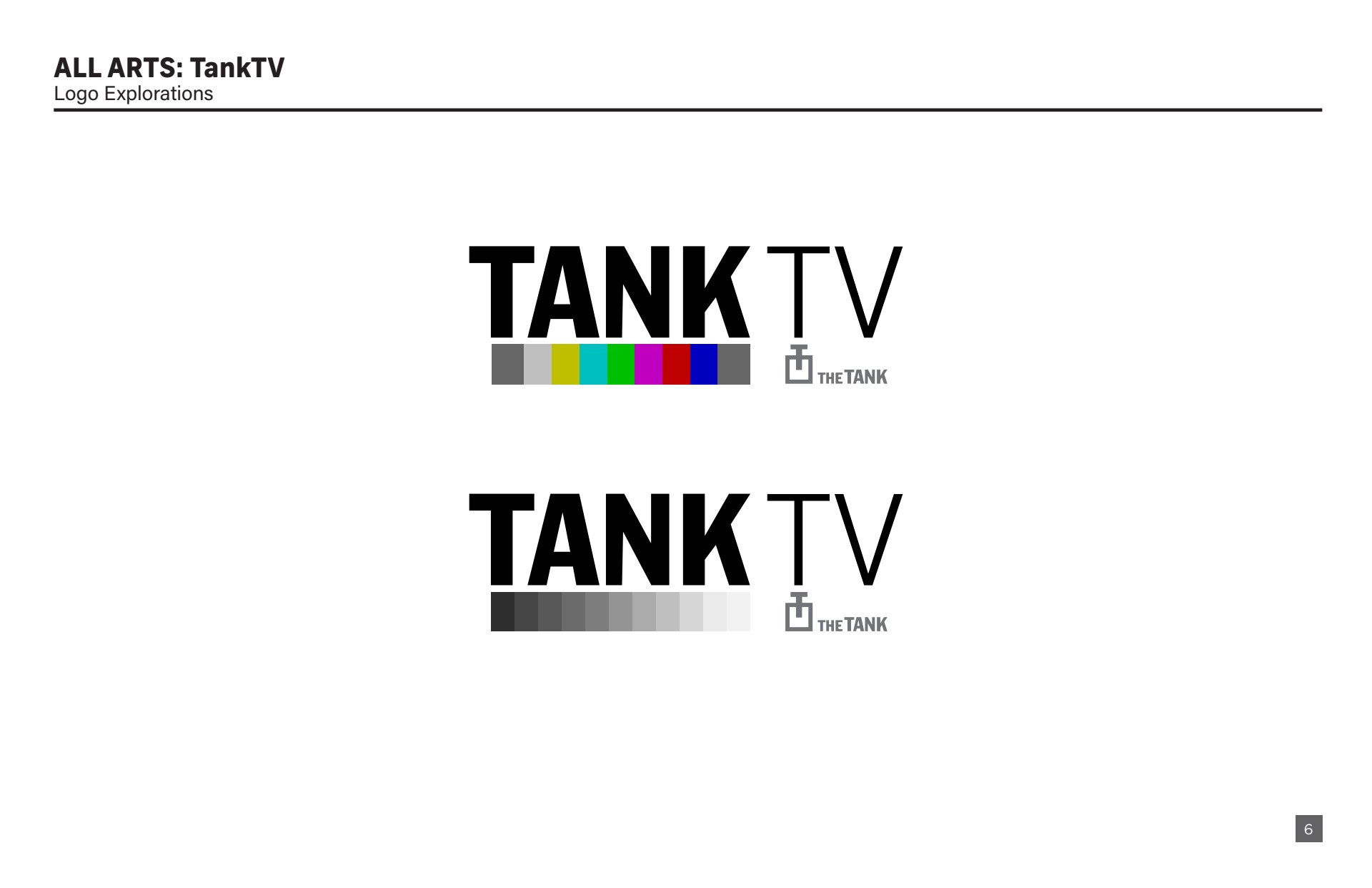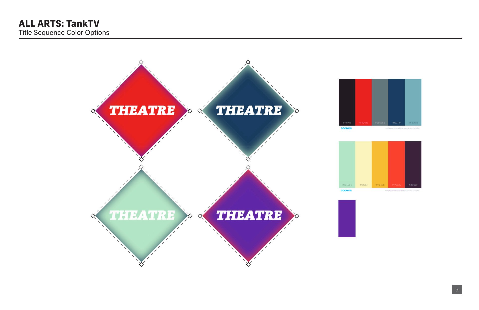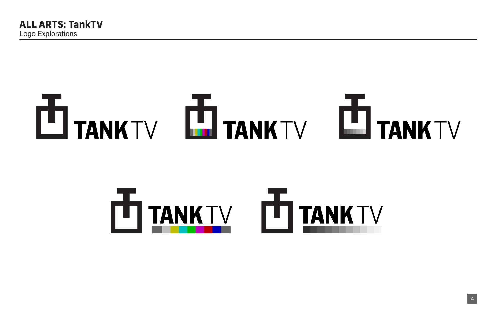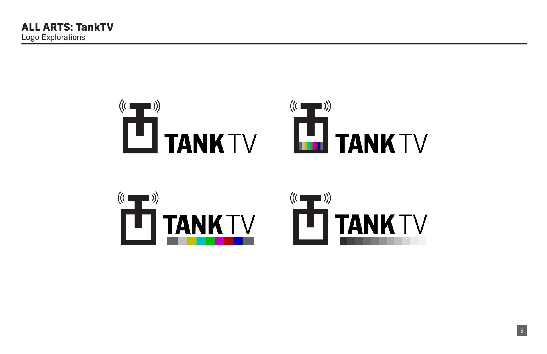 Design presentation, including logo explorations, show open storyboard, and color palette options for All Arts TankTV