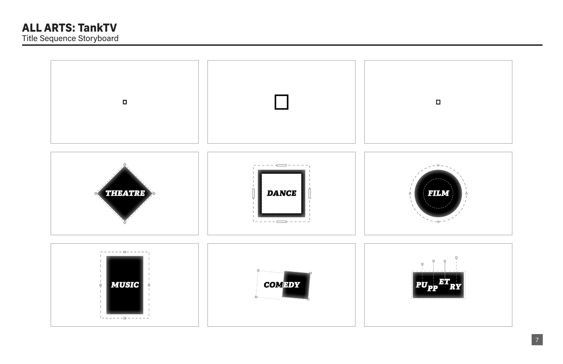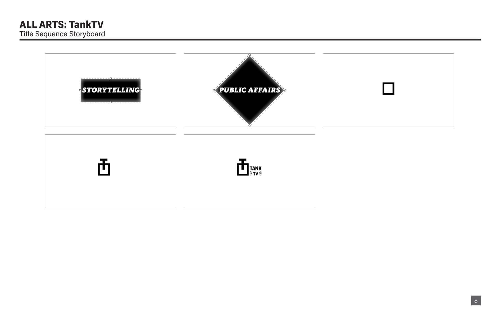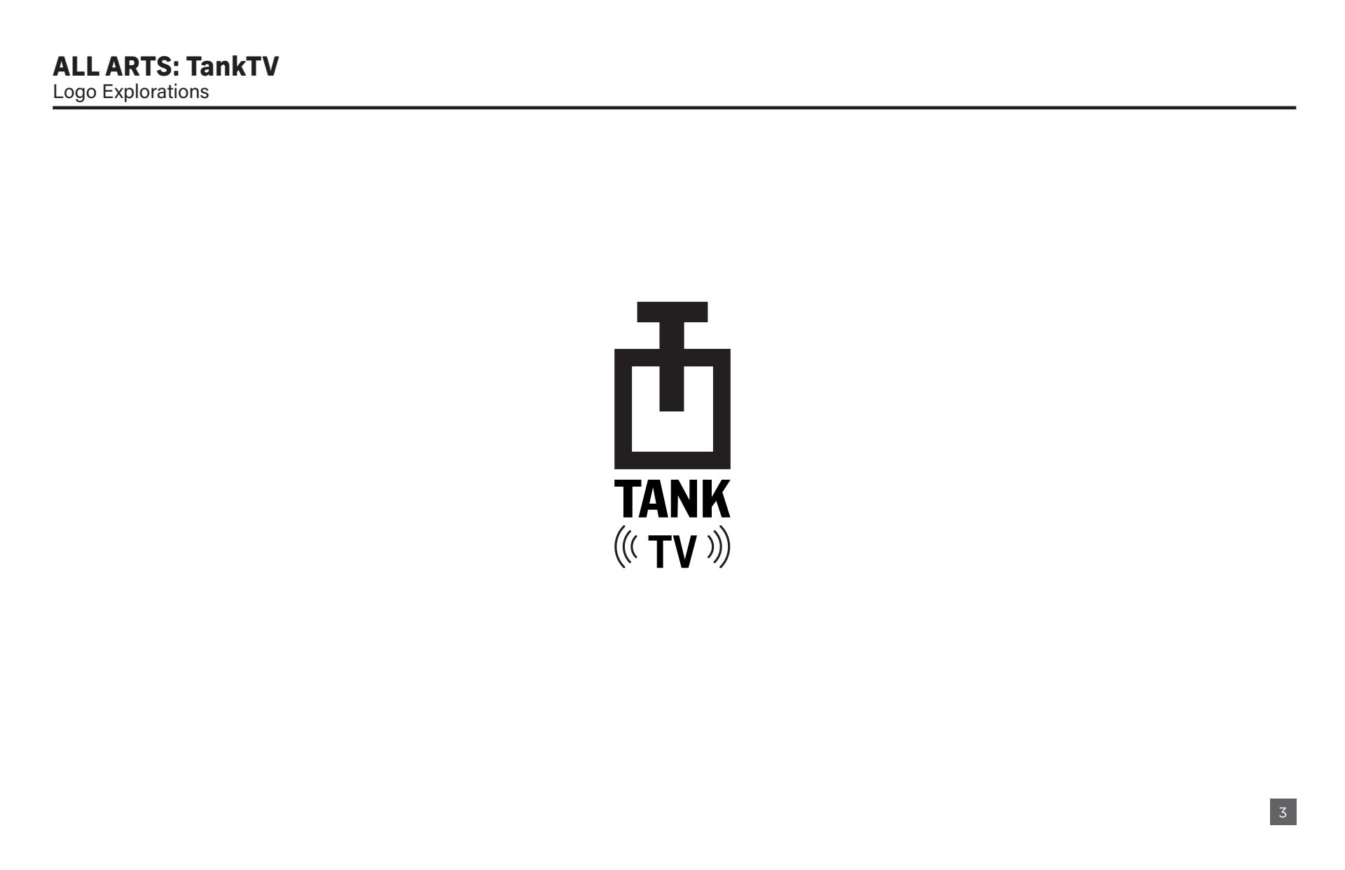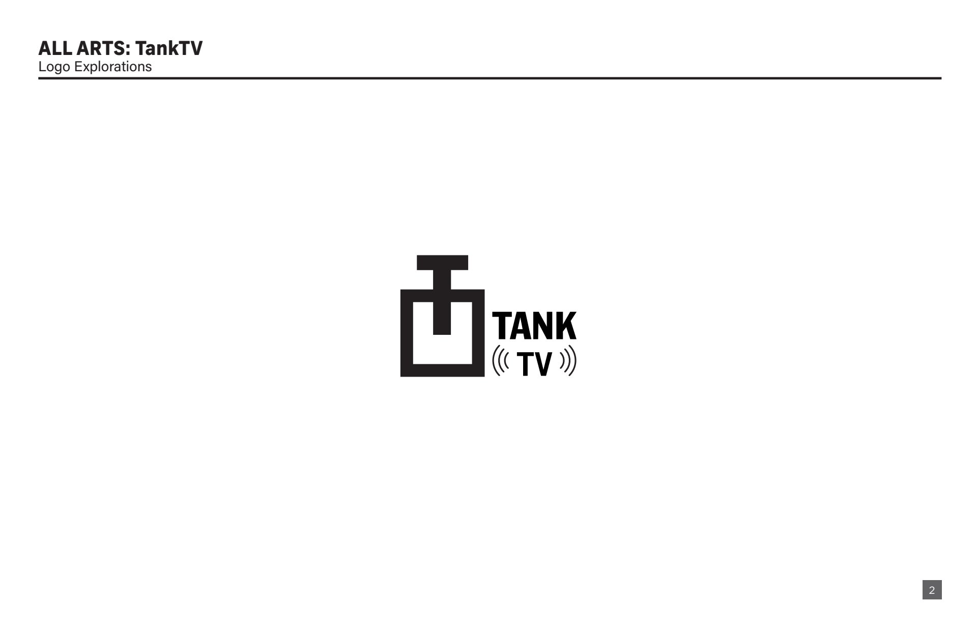 Design presentation, including logo explorations, show open storyboard, and color palette options for All Arts TankTV